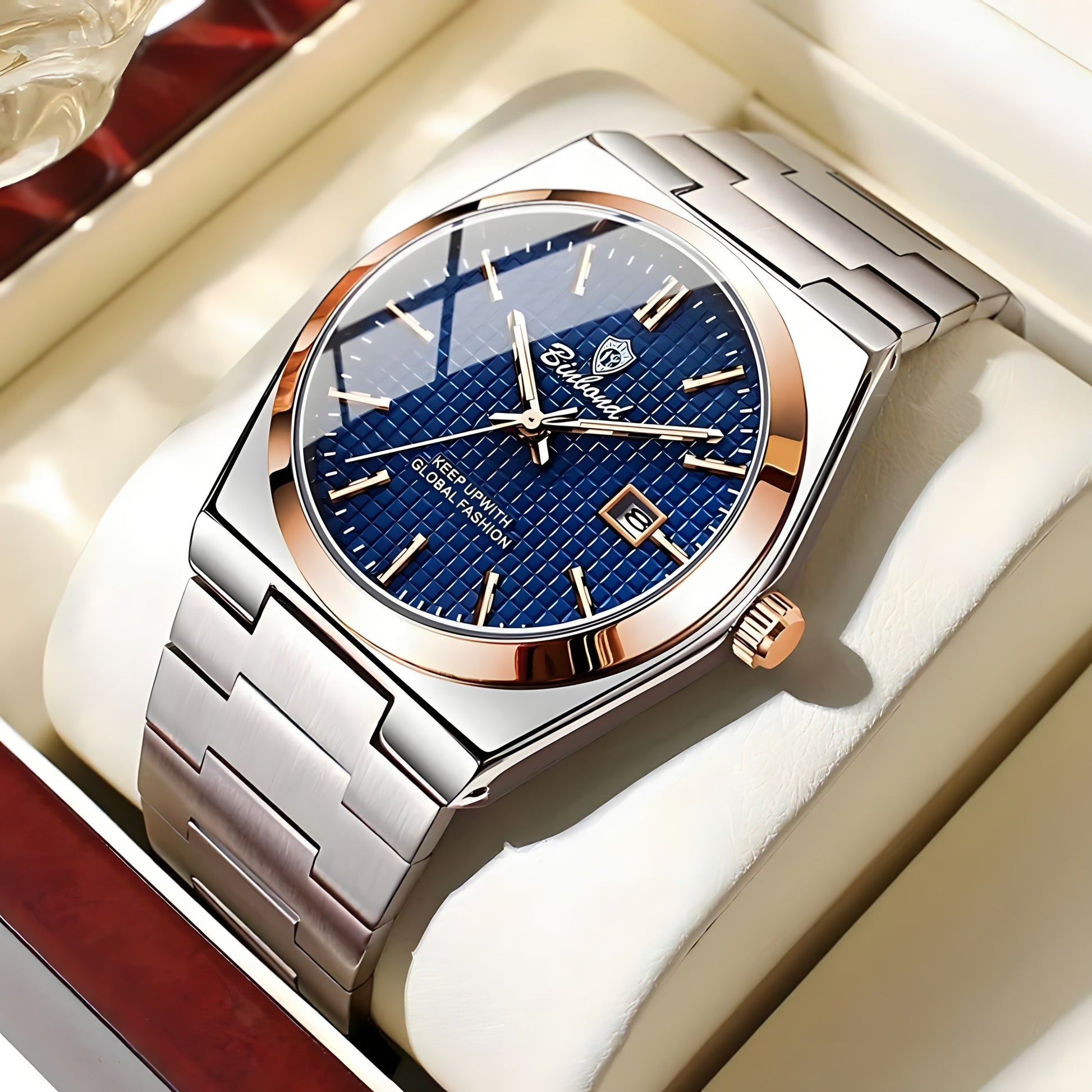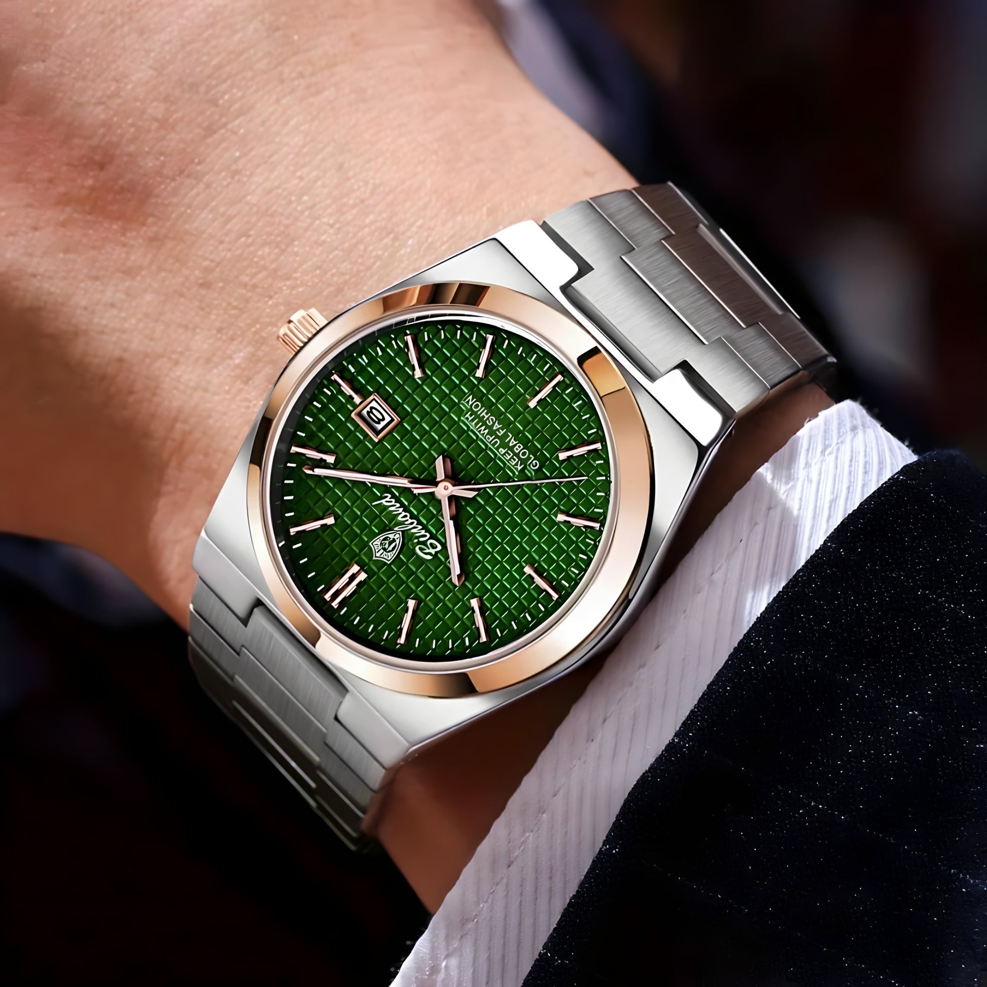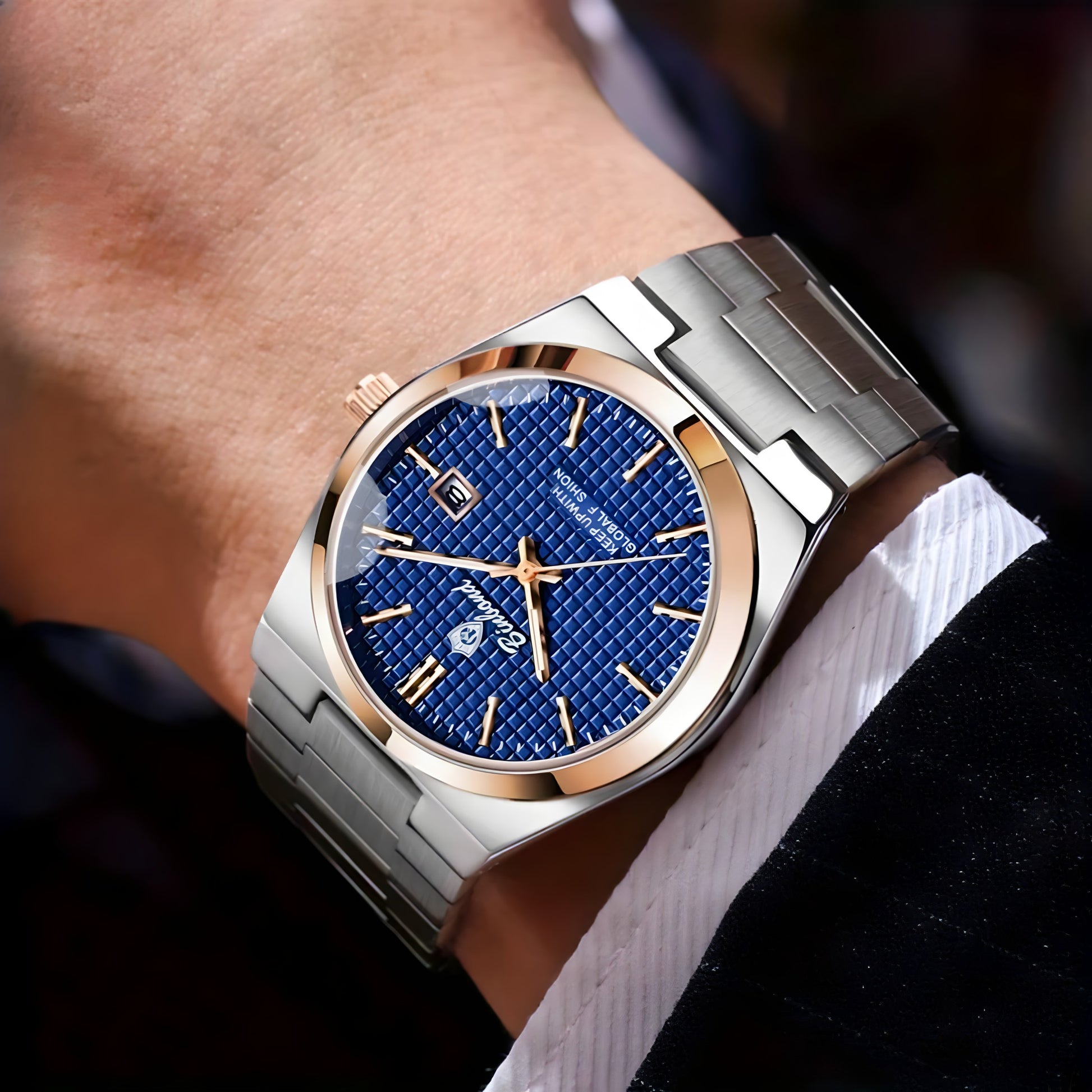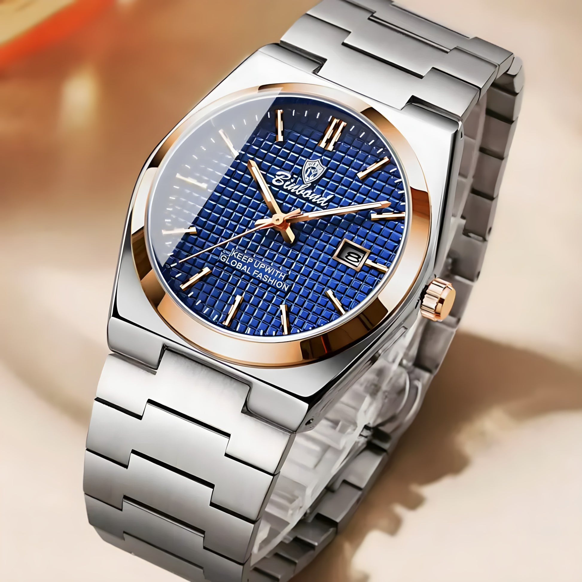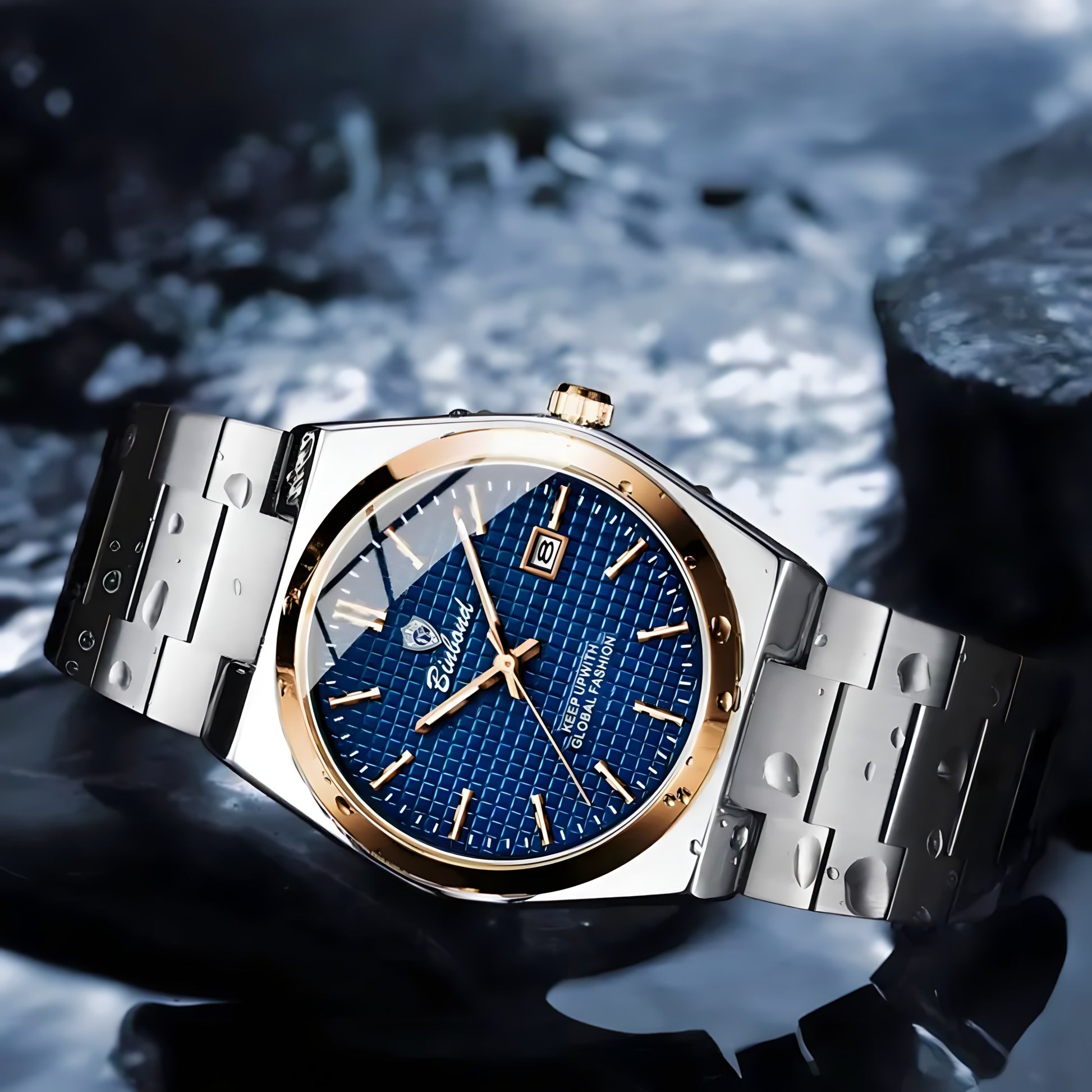 Glacius features a textured dial, high-grade metallic finishes, and a robust stainless steel construction.